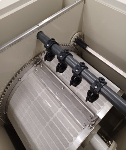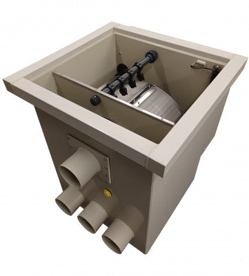 - This drum filter is fitted with a cover switch, which cuts power to the drum motor and UVs when the lid is lifted off.